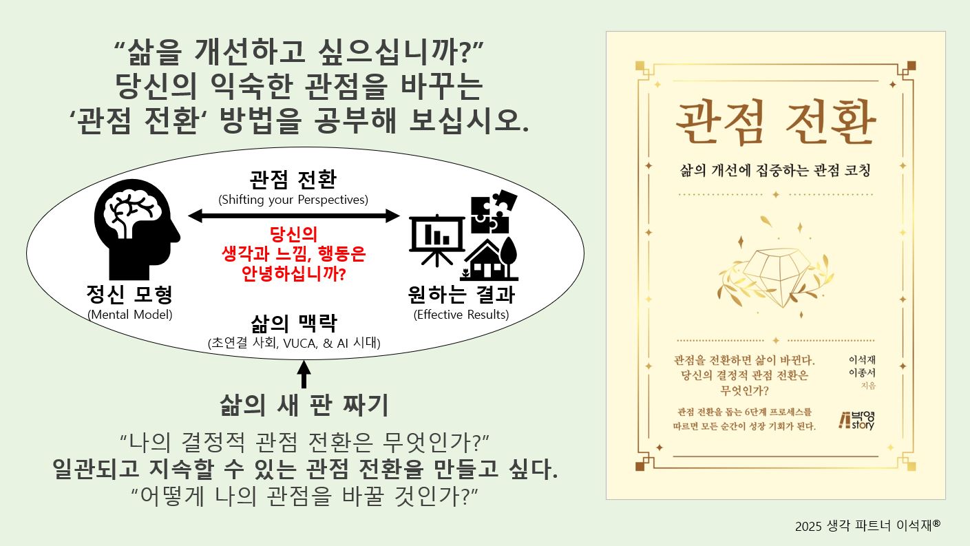 2. 이러한 관점 전환을 위해서는 구조화된 프로세스가 중요합니다. 신간 <관점 전환>에서 당신에게 필요한 관점 전환을 돕는 6단계 프로세스를 만들어 보시기 바랍니다. 지난 23년의 현장 코칭을 통해 검증한 관점 전환을 돕는 방법을 소개합니다. 생각 파트너는 이러한 방법론을 '결정적 관점 코칭'(줄여서 관점 코칭)이라고 이름 붙였습니다.